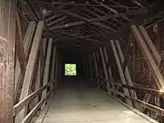 In August 1868, a contract was awarded by the Linn County Commissioners to Bishop & Eaton for a bridge across Locust Creek, with the cost not to exceed 5,500 dollars.[5] The structure is a Howe truss, constructed of white pine. Vertical iron rods tightly secure diagonal wooden beams to the bottom and top of the structure.[3] In addition to its utilitarian function, over time the bridge was a hangout for locals with some proclaiming their love for one another and their presence at the bridge with carvings along the bridge's internal walls. As a popular fishing and swimming spot, the bridge was visited by John J. Pershing; his boyhood home and the state park bearing his name are nearby.[3]