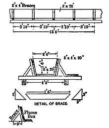 Log flumes need a steady supply of water. Often, a log pond or artificial reservoir serves this purpose.[4]: 16 The head directs the flow of water into the top of the flume. Flume boxes are built tight with lumber free of knots to prevent leaks. Feeder troughs resupply water on long routes.[1]: 410