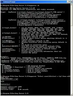 logparser is a flexible command line utility that was initially written by Gabriele Giuseppini,[1] a Microsoft employee, to automate tests for IIS logging. It was intended for use with the Windows operating system, and was included with the IIS 6.0 Resource Kit Tools. The default behavior of logparser works like a "data processing pipeline", by taking an SQL expression on the command line, and outputting the lines containing matches for the SQL expression.