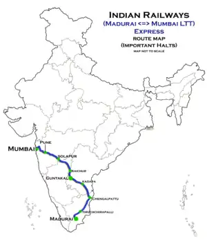 Lokmanya Tilak Terminus–Madurai Express is a Superfast train of the Indian Railways connecting Lokmanya Tilak Terminus in Mumbai, Maharashtra with Madurai Junction in Tamil Nadu. It is currently being operated with 11043/11044 train numbers on a weekly basis. From May 2021, it was converted into Superfast Express, with new timings. Also ICF coach were replaced by LHB coach.[1][2]