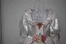 The main feature of Lolita fashion is the volume of the skirt, created by wearing a petticoat or crinoline.[18][19][20] The skirt can be either bell-shaped or A-line shaped.[20] Components of the lolita wardrobe consist mainly of a blouse (long or short sleeves) with a skirt or a dress, which usually comes to the knees.[21] Lolitas frequently wear wigs in combination with other headwear such as hair bows or bonnets (similar to poke bonnets). Lolitas can also wear Victorian style drawers under their petticoats. For further effect, some Lolitas use knee socks, ankle socks, or tights, together with either high heels or flat shoes with a bow. Other typical Lolita garments include jumperskirts (JSK) and one-pieces (OP).[22]