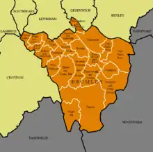 The borough is the largest in Greater London by area and occupies 59 square miles (153 km2). The majority of the borough is Metropolitan Green Belt, including nearly all of the land south of the A232-A21 route between West Wickham and Pratt's Bottom.[1] Consequently, it is also perhaps the most rural borough and contains more of the North Downs than any other, as that escarpment is broad between Bromley and Banstead. This is also reflected in its population density, which is the lowest of the 32 London boroughs.[2]