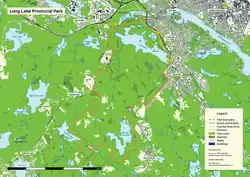 Long Lake Provincial Park is home to a number of lakes and ponds. The eponymous Long Lake, with an area of 154 hectares (380 acres), is the largest. It was created in the 19th century when a wooden dam was built on McIntosh Run, causing rising water levels to connect two pre-existing lakes, Cocked Hat Lake and Beaver Lake. The resultant Long Lake has a maximum depth of 30 metres.[1]