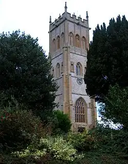 Holy Trinity church dates from 1493. An earlier church would have stood on this site from the 9th century or earlier. The current church was built of local lias stone cut and squared, with hamstone dressings. It has stone slate roofs between stepped coped gabled with finials to the chancel and north porch. Internally, the chancel has a ceiled wagon-roof, with moulded ribs and plaster panels. The tower exhibits the tracery typical of Somerset towers. The under-tower space has a lierne vault, and a 15th-century octagonal font with quatrefoil panels. The building has been designated by English Heritage as a Grade I listed building.[14] The tower has a ring of six bells, the tenor weighing 136 stone (864 kg).[15]