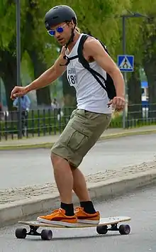 Longboard decks can be shaped in such a way that they bow up or down along the length of the board. They can also have a downward bend along the width of the board.[11] Concave boards, which bend upward on the sides, give the rider more friction for their toe and heel, thus giving them more control. A camber board is a gradual upward arch along the length of the board. This sets the center of the board above the truck mounts. This is often used on flexible boards to prevent the board from sagging when it is being ridden. A "rocker" shape is the opposite of camber, which sets the center of the board below the truck mounts when it is being ridden. This lets the rider more easily perform tricks like sliding by locking their feet into the board.[12]