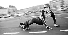 Grip tape is a gritty material on the top of the board that provides traction so that shoes stay on the board.[17] The tape comes in rolls that have a strong adhesive on the bottom. They are applied to the top of the board and then cut to fit the shape. Black sheet is the most common, however they can come in many colors or even can come in the form of a clear spray on adhesive. Most black grip tape is made of silicon carbide which provides excellent grip and stays sharp for a long time. However, some black tape and most colored tape is made from aluminum oxide which is a cheaper material and will lose a lot of grip over time. The tape gets dirty after a lot of use, which is more apparent on the clear and lighter colors. It will lose a lot of the grip after using it for a while, but it is easily replaced by heating the board to loosen the adhesive on the bottom and using a razor blade to separate it from the board.