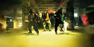 The video begins with scenes of Brown wearing a mirrored mask inside a giant birdcage, before switching to a dance routine in a smoke-filled, graffiti-covered parking garage. The mask was created for Brown by producer-collaborator Nick Marsh. In between these scenes, the video shows a Step Up-type dance-off in the parking garage.[17] When Brown raps his verse, he is seen standing next to Rhymes, wearing horn-rimmed glasses, a red Brooklyn cap, and a white baseball jersey, which was the signature look of Mars Blackmon from the 1986 film, She's Gotta Have It.[16] Rhymes then raps his verse after Brown's, standing beside him and later on the stairs in the parking garage. Wayne's verse soon follows after, with scenes of him rapping in front of the DeLorean sports car, and also on top of an ambulance car. The video also features cameo appearance from Kevin McCall, Diplo, Birdman, Tyga and Mack Maine. Birdman and Maine appear when Lil Wayne is performing his verse.