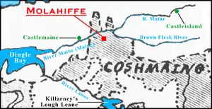 The area of the original Lordship of Molahiffe was within the territory of the Paramount Lordship of Cosmaigne/Coshmaing (specifically, the area known as East Cosmaigne), and descended from the original appanage of Sliocht Eóghan na Coshmaing. Although, in the present day, no territory attaches to the title of Lord (Baron) of Molahiffe, it was, in the 14th-century, located in the Kingdom of Desmond, in modern-day County Kerry, Barony of Magunihy. The northern boundary of the Lordship of Molahiffe (as well as the Kingdom of Desmond, Coshmaing, and the Barony of Magunihy) was the River Maine, which flows into Dingle Bay at Castlemaine Harbor. However, as Butler notes, "The two projections of the barony to the north of the Maine are in Molahiffe...."[4] (see map). The area of Molahiffe projecting to the north of the River Maine (Maing) extended to the ridgeline of the Slieve Mish mountain range,[5] which partly bisects the Dingle Peninsula.