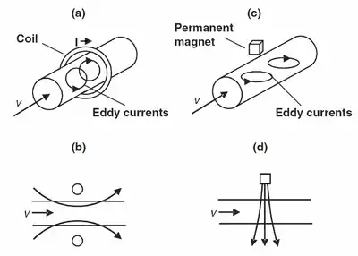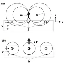 So, when a liquid metal moves across magnetic field lines, the interaction of the magnetic field (which are either produced by a current-carrying coil or by a permanent magnet) with the induced eddy currents leads to a Lorentz force (with density ) which brakes the flow. The Lorentz force density is roughly