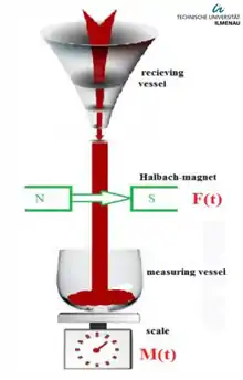 The force measurement system is an important part of the Lorentz force velocimetry. With high resolution force measurement system makes the measurement of even lower conductivity possible. Up to date has the force measurement system continually being developed. At first the pendulum-like setups was used (Figure 5). One of the experimental facilities consists of two high power (410 mT) magnets made of NdFeB suspended by thin wires on both side of channel thereby creating magnetic field perpendicular to the fluid flow, here deflection is measured by interferometer system,.[16][17] The second setup consists of state-of-art weighting balance system (Figure 6) from which is being hanged optimized magnets on the base of Halbach array system. While the total mass of both magnet systems are equal (1 kg), this system induces 3 times higher system response due to arrangement of individual elements in the array and its interaction with predefined fluid profile. Here use of very sensitive force measuring devices is desirable, since flow velocity is being converted from the very tiny detected Lorentz Force. This force in combination with unavoidable dead weight of the magnet () is around . After that, the method of differential force measurement was developed. With this method two balance were used, one with magnet and the other is with same-weight-dummy. In this way the influence of environment would be reduced. Recently, it have been reported that the flow measurements by this method is possible for saltwater flows whose electrical conductivity is as small as 0.06 S/m (range of electrical conductivity of the regular water from tap).[18]