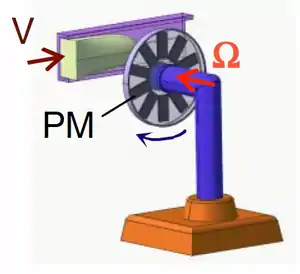 Rotary LFF consists of a freely rotating permanent magnet[9] (or an array of magnets mounted on a flywheel as shown in figure 4), which is magnetized perpendicularly to the axle it is mounted on. When such a system is placed close to a duct carrying an electrically conducting fluid flow, it rotates so that the driving torque due to the eddy currents induced by the flow is balanced by the braking torque induced by the rotation itself. The equilibrium rotation rate varies directly with the flow velocity and inversely with the distance between the magnet and the duct. In this case it is possible to measure either the torque on the magnet system or the angular velocity at which the wheel spins.