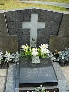A 2.1-kilometre (1.3 mi) road in the centre of Vilnius is named Loretos Asanavičiūtės gatvė in her memory; it was formerly named Žvaigždžių, and renamed in 1996.[4] A linden tree has been planted in her memory, along with oaks for her male fellow victims.[1] She is buried in the Antakalnis Cemetery in Vilnius.