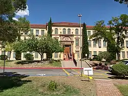 The building was designed by Trost & Trost.[9] Gustavus A. Trost was friends with Mother Praxedes and may have done most of the primary architectural drawings.[10] The buildings were "designed to face Mexico" in a welcoming gesture for all people to join the community.[4] They were built using stuccoed brick and red Spanish tile on the roof.[9] The first building was started in the fall of 1922.[11] The cornerstone for the chapel was laid down on March 20, 1924.[7] The entire campus was not complete until the 1930s.[9] However, the first school building was ready in 1923. Loretto Academy in El Paso opened on September 11, 1923 with 186 students, of which 20 lived at the school as boarders.[7] In 1928, the Southern Association of Colleges and Secondary Schools admitted Loretto as a member.[12]