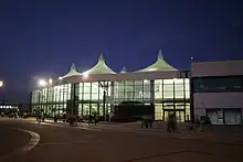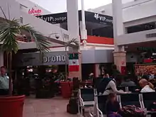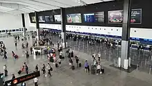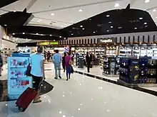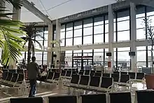 The airport operates two terminals. Terminal 1, covering an area of 16,580 square metres (178,500 sq ft), manages arrival and departure facilities for domestic flights within a single-story building. It features a distinctive roof over the departures concourse with peaked white structures. The arrivals area includes a baggage claim area, car rental services, taxi stands, snack bars, and souvenir shops. The departures section includes a check-in area, a security checkpoint, and a concourse with a food court and 8 gates on the ground level, allowing passengers to walk to their aircraft. From this departure concourse, access to a mezzanine is available, which houses a VIP lounge.[5]
