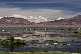 Salar de Pujsa is a salt flat located southwest of Salar de Tara, 83 kilometers from San Pedro de Atacama, and northeast of Acamarachi volcano. With a maximum elevation of 4,585 metres above sea level, Pujsa is considered the most isolated section in the reserve. The salt flat receives the waters of the Quepiaco and Alitar creeks and was listed as a Ramsar site in 2009.[11] Birds that migrate across the hemispheres use the salt flat and surrounding land as a staging area, including the Wilson's phalarope.[11]