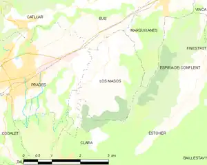 Los Masos is located in the canton of Les Pyrénées catalanes and in the arrondissement of Prades.[3] The town is also part of the historical region Conflent and is situated 4 km east of Prades.