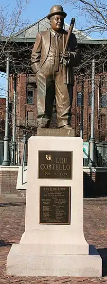 On June 26, 1992, the city of Paterson, New Jersey, in conjunction with the Lou Costello Memorial Association, erected a statue of Costello in the newly named Lou Costello Memorial Park in the city's historic downtown section. It shows Costello holding a baseball bat, a reference to the team's most famous routine, "Who's on First?". The statue has been shown in two episodes of The Sopranos and in the film Paterson (2016). In 2005, Madison Street, in the Sandy Hill section of Paterson where Costello was born,[40] was renamed Lou Costello Place.[41]