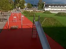 Eight grass pyramids in the lawn reveal aspects of the local history. They form the quasi pro-turbances of the conspicuous lawn funnels of the former ammunition huts. The park’s patchwork is complemented with a band of play equipment for toddlers, a blue sports pitch for ball games and a timber stage.[3]