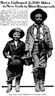 Louis Van "Bud" Abernathy (December 17, 1899 – March 6, 1979) and Temple Reeves "Temp" Abernathy (March 25, 1904 – December 10, 1986) were children from Oklahoma who, without adult supervision, took several cross-country trips. On one trip they rode on horseback from Oklahoma to Manhattan in 1910 when they were 10 and 6 years old.[1]