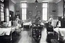 The new yellow-brick building with slate roofs echoed the construction materials used by its larger neighbour, the Cambridge Military Hospital. It cost £12,600 to build[3] and had "sanitary blocks" incorporated in "Italianate" corner towers towards the back.[4] There were fifty-three beds arranged in eleven wards of different sizes, including wards named for Queen Victoria, the Duke of Connaught and Lord Lansdowne. The staircases had shallow steps, supposed to help nurses in long dresses run up and down.[5] A "fine" tiled operating theatre was added in 1908 and officially opened by the Duchess in 1909. It had a new sort of "brilliant light" and Doulton basins and sinks "fitted with the latest kind of mixing valves for hot and cold water with elbow-action and sprays".[6] Within a couple of years the hospital was treating around 1000 cases annually: about half in its General Division and half in its Maternity Division which had twenty-five "swing cots" along with twenty-five beds.[6]