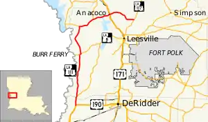 The route parallels the Texas state line, located along the Sabine River, from a point north of Merryville to the south end of the Toledo Bend Reservoir. Its direction then changes from north–south to east–west as it bends around the northwest side of the Leesville area, though this is not reflected on its directional banners. During this stretch, the highway crosses Vernon Lake and passes through the village of Anacoco, where it intersects US 171. A lightly traveled rural route, LA 111 also provides access to the Toledo Bend Dam and South Toledo Bend State Park.