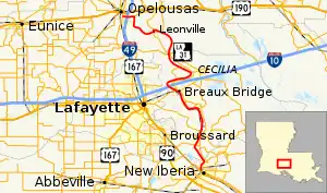 Louisiana Highway 31 (LA 31) is a 54.6-mile-long (87.9 km) north–south state highway in Louisiana that serves Iberia, St. Martin, and St. Landry parishes, extending from LA 182 in New Iberia, and ending at the same highway in Opelousas.[2]