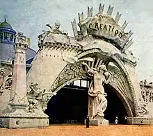 Entrance to the exhibit "Creation" on the Pike, a spectacle portraying the first six days in the Book of Genesis. This exhibit was dismantled and moved to Coney Island's Dreamland amusement park at the end of the fair.[35]