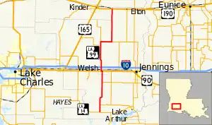 The highway bisects the sparsely populated Jefferson Davis Parish as it zigzags along rural section line roads. Roughly halfway along its route, LA 99 passes through the town of Welsh and an interchange with Interstate 10 (I-10), the region's main east–west highway. It also intersects US 90, an older parallel corridor that now acts largely as a business route in the area.