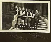 Hickman led Louisville to its first championship on a national level by winning the NAIB tournament in 1948.[6] In 1956, led by All-American Charlie Tyra, the Cardinals won the NIT Championship.[7] In 1956 his team was placed on two years probation, to include bans on postseason play, by the NCAA due to recruiting violations.[8] In 1959, Louisville made its first NCAA Final Four appearance behind the play of All-American Don Goldstein.