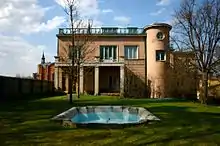 The Finnish Museum Board has declared the Esplanadi area in Loviisa around the market square as a nationally significant cultural area.[22] Esplanadi has also been chosen as the cultural landscape of the year in the Western Kymi cultural road in 2019.[23] The principal buildings in the area include the pink city hall (Georg Theodor Chiewitz 1862), the Neo-Gothic Loviisa church (Georg Theodor Chiewitz and Julius Basilier 1865) and Finland's oldest surviving wooden social club (Georg Theodor Chiewitz 1863 and Selim A. Lindqvist 1907).[22] Historical districts in the central conurbation include the city centre and the districts of Alakaupunki, Garnisoni and Uusikaupunki. Alakaupunki was spared in the 1855 fire, and it contains the auxiliary building of the Degerby horse stead dating from the 1690s. It is one of Finland's oldest wooden buildings. Uusikaupunki was built as a workers' district to the west of the railway station in the early 20th century.[9]: 122