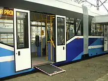 A low-floor tram is a tram that has no stairsteps between one or more entrances and part or all of the passenger cabin. The low-floor design improves the accessibility of the tram for the public, and also may provide larger windows and more airspace.[1]