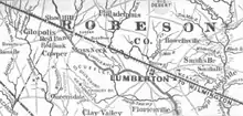 In 1835 the Constitution of North Carolina classified the eastern Carolina Native Americans as "free persons of color".[3] While having previously enjoyed the same political rights as white people, the Lumbees were disenfranchised by the new constitution.[8] In 1840 the North Carolina General Assembly passed a law prohibiting free nonwhites from bearing arms without a license from the Court of Pleas and Quarter Sessions in their county. In 1853 the North Carolina Supreme Court affirmed the legality of the law in its ruling for State v. Noel Locklear, involving the case of a man convicted of unlawful possession of a firearm.[9] White farmers in Robeson County also sought ways to obtain Lumbees' land or labor. According to Lumbee oral tradition, the "tied mule" incidents were emblematic of this. In these scenarios, a farmer would tie his mule on a Lumbee's land and release some of his cattle there, before bringing local authorities to the scene to accuse the Lumbee landowner of theft. Doubtful of a fair trial in the courts, a Lumbee would settle with the farmer by either offering him a portion of land or free labor.[10] The legal discrimination and exploitative practices heightened racial tensions in the area.[11][12]