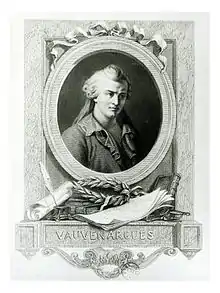 Luc de Clapiers, marquis de Vauvenargues (French: [vovnaʁɡ]; 6 August 1715 – 28 May 1747) was a French writer and moralist. He died at age 31, in broken health, having published the year prior—anonymously—a collection of essays and aphorisms with the encouragement of Voltaire, his friend. He first received public notice under his own name in 1797, and from 1857 on, his aphorisms became popular. In the history of French literature, his significance lies chiefly in his friendship with Voltaire (20 years his senior).