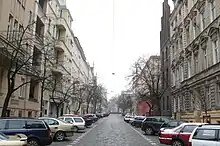 - ↑ out of 3 buildings pictured the only one still standing is the partially visible one in the back; the other ones were heavily damaged during the fightings in February 1945 and eventually demolished afterwards