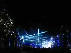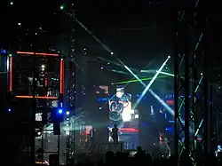 The three-story stage ran parallel to the midway. The back of the stage is 25 feet (7.6 m) high and the length is 75 feet (23 m) long.[4][5][17] Several screens were located on behind the main stage with two that showed close-ups of the performers on the sides of the stage. The stage had video walls made of one-hundred twelve MVP 18 and thirty-seven MVP 37.5 modular video panels.[11] Two screens are next to the control booths and bleachers.[18]
