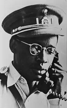 In October 1958 a group of Léopoldville évolués including Patrice Lumumba, Cyrille Adoula and Joseph Iléo established the Mouvement National Congolais (MNC). Diverse in membership, the party sought to peacefully achieve Congolese independence, promote the political education of the populace, and eliminate regionalism.[22] The MNC drew most of its membership from the residents of the eastern city of Stanleyville and from the population of the Kasai Province, where efforts were directed by a Muluba businessman, Albert Kalonji.[23] Belgian officials appreciated its moderate and anti-separatist stance and allowed Lumumba to attend the All-African Peoples' Conference in Accra, Ghana, in December 1958. Lumumba was deeply impressed by the Pan-Africanist ideals of Ghanaian President Kwame Nkrumah and returned to the Congo with a more radical party programme,[24] demanding the country's "genuine" independence.[19] Fearing that they were being overshadowed by Lumumba and the MNC, Kasa-Vubu and the ABAKO leadership announced that they would be hosting a rally in the capital on 4 January 1959.[19] The municipal government issued a de facto ban on the event. ABAKO supporters were infuriated and, at the scheduled time of the rally, initiated three days of violent and destructive riots.[25] The Force Publique (the colonial army) suppressed the revolt with considerable brutality.[26] On 13 January the Belgian King, Baudouin, declared that independence would be granted to the Congo in the future.[26]