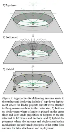 This article incorporates text from this source, which is in the public domain. - ↑ Wang, Rebecca; Gehlot, Vinod P.; Bandyopadhyay, Saptarshi; McGarey, Patrick M.; Byron, Benjamin; Pisanti, Dario; Wilson, Ron; Jenks, Kenneth (23 January 2023). "Lift Wire Deployment and Anchoring System for the Lunar Crater Radio Telescope on the Far Side of the Moon". AIAA SCITECH 2023 Forum. American Institute of Aeronautics and Astronautics. doi:10.2514/6.2023-1787. ISBN 978-1-62410-699-6. S2CID 256134317.