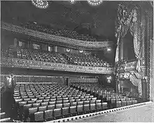 Frohman had offices on the upper portion of the main 45th Street structure, while the rear annex on 46th Street contained auxiliary facilities such as storage and dressing rooms.[26][25] The color scheme of the interior was compared in contemporary media to autumn foliage, with a range of hues from "deep yellow to warm red and brown".[26][27][28] From the outset, the auditorium was designed to use electric lighting exclusively. A switchboard controlled the stage lighting, which could be controlled to be as bright as natural illumination. The theater was also mechanically advanced for its time, with heating, cooling, and ventilation systems, as well as a fireproof structural frame. The air-intake system consisted of blowers that drew air from the chimneys and passed the air through a porcelain duct, a set of silk filters, and water sprayers. The auditorium floor had "mushrooms" for air intake and outflow.[17] The heating and ventilation system could change the auditorium's air every six minutes.[28]