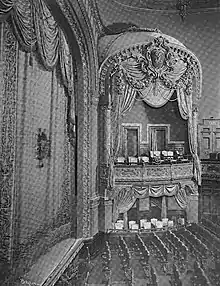 On either side of the stage is a wall section with one box at the first balcony level.[18] Each wall section consists of Ionic-style fluted and banded columns, which support an elliptical arch. The boxes themselves are supported on large brackets, which in turn rest above piers with foliate capitals. In front of each box is a curved railing with leaf moldings. There is a cartouche with an "L" motif atop the boxes' arches, and a swag shaped like a leaf is suspended from the cartouche.[37]