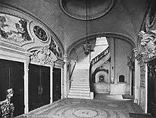 To the west and east are curving stairs leading up to the first balcony level.[15][17][29] The staircases are covered in marble but are actually made of steel.[15] The outer walls of the staircases contain marble dados, as well as bronze railings attached to them. The inside edges of the staircases have bronze balustrades with cast-iron and wrought-iron decorations, as well as newel posts containing nude figures.[18] The east wall also has ticket windows.[29] Another stair to the west leads down to the smoking room.[17] At the balcony level was a foyer and smoking rooms.[15]