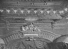 The coved ceiling is distinguished by console brackets with swags, and there are decorations of bellflowers within the cove. The ceiling is divided into ribs, containing bands with fruits and flowers. The center of the ceiling contains a rectangular panel with modillions around it, as well as floral cartouches and latticework inside. Around this panel are circular "L" motifs. Guilloche moldings hang over the second balcony.[40] The ceiling lacked a chandelier, as the designers thought it would be distracting to the performers and audience. Instead, there are recessed light fixtures in the ceiling.[20][28]