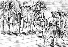 According to Plutarch's Lives and other sources, when Lycurgus became confident in his reforms, he announced that he would go to the oracle at Delphi to sacrifice to Apollo. However, before leaving for Delphi he called an assembly of the people of Sparta and made everyone, including the kings and Gerousia, take an oath binding them to observe his laws until he returned. He made the journey to Delphi and consulted the oracle, which told him that his laws were excellent and would make his people famous. He then disappeared from history. One explanation was that being satisfied by this he starved himself to death instead of returning home, forcing the citizens of Sparta by oath to keep his laws indefinitely.[16] He later enjoyed a hero cult in Sparta and Spartans retained much respect towards him.[17][18]