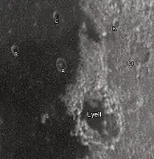 By convention these features are identified on lunar maps by placing the letter on the side of the crater midpoint that is closest to Lyell.