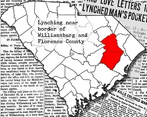 ![]() News coverage of a lynching in South Carolina with map of Florence County and Williamsburg County, SC | |