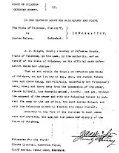 During a hearing on May 6 before Justice Lawrence, Austin was held on a bond of $1,500, which he was unable to pay.[37] After pleading guilty to larceny, he was sentenced on May 12 to three years in Oklahoma State Penitentiary.[38] On May 16 he was sent to the state prison in McAlester 59 miles (95 km) away, which according to the Ledger probably saved his life.[39][40] On May 10, before the same judge, Laura and L. D. (named by the Ledger as Mary and L. W. Nelson) were charged with murder and held without bail in the Okemah county jail. The Nelsons hired Blakeley, Maxey & Miley, a law firm in Shawnee, to represent them.[37] The Ledger reported on May 18, under the headline "Negro Female Prisoner Gets Unruly", that on May 13 Laura had been "bad" when the jailer, Lawrence Payne, brought her dinner. She had reportedly tried to grab his gun when he opened the cell door, and when that failed she tried to throw herself out of a window. Payne "choked the woman loose", according to the newspaper, and after a struggle returned her to her cell.[40] The Ledger wrote on May 25 that during the incident she had "begged to be killed".[39]
