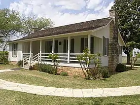 The Johnson City Unit is located on the south side of the city, with parking areas at the visitor center on Lady Bird Lane, and on United States Route 290 at N Street. The visitor center, located in a former hospital, provides an introduction to the park, exhibits and films about President Johnson and his wife Lady Bird. A short way north of the visitor center is the Johnson Boyhood Home, an 1880s Victorian house where he lived with his parents from age five. This house, restored by Johnson while he was president, was designated a National Historic Landmark in 1965.[7] West of the visitor center is the Johnson Settlement, a restored prairie in which are found the dogtrot house of Johnson's grandfather, and other 19th-century agricultural buildings.