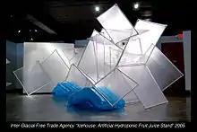 Art critic Amy Karlinsky, writing in BorderCrossings, opined that Richardson's "minimal and collapsible" Red State "hinted at her capacity to generate metaphor": its "monumentality" was "all sham and seductive illusion – a tidy reference to both art and politics". And Karlinsky had earlier enjoyed "Richardson's fabulous and funny kinetic sculptures of 2002", which in her view "invited viewer participation and provided wry commentary on Canadian icons and symbolism".[2] But Karlinsky found Inter-Glacial Free Trade Agency.ca "more fraught" by contrast, and agreed with the exhibition curator that Richardson's environmental concerns were integral to her works and had "catalyzed" her into production. How, she wondered, did you suggest something as vast as the Arctic? "A simulated and disjointed landscape confronts the viewer. It is a depopulated, dystopic scenario" with strange artistic details. "Much is eerie, evocative and otherworldly."[2]