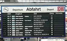 A new split-flap display was installed in 1981 at the cross platform concourse. The individual platforms, except for the Holzkirchen wing station platforms, were given split-flap destination displays. These replaced panels that were once attached to the buffer stops. Some still exist at the Holzkirchen wing station, but are no longer used. An additional 37 monitors were installed at internal sites such as the ticket office. All displays are controlled by a computer, on which all changes to the basic timetable are stored. They are updated by the signal centre.[15] A washing plant was established to the south of the tracks for Intercity-Express trains in 1991 and in the following years it was expanded into an ICE depot.[41] Since 2004, the entire area of the station has video monitoring.[42] The 70 cameras are controlled by the control center of DB Security in the station.[43] Meanwhile, the split-flap displays have been replaced with more modern LCD displays. The loudspeaker systems have also been modernised.