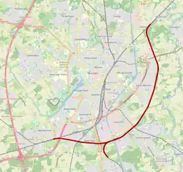 The bypass begins at Bbf (Betriebsbahnhof, “operations” station, which mainly consists of passing loops) Mecklenbeck on the Wanne-Eickel–Münster line. It runs east around the city and ends at Bbf Sudmühle on the Münster–Osnabrück line. In addition, there is also possible to connect to Lechtenberg junction on the Münster–Hamm railway to run over the bypass towards Sudmühle (or vice versa).