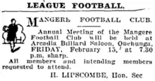 There was no indication that the Māngere club was going to cease to exist. On August 6 it was reported that the Māngere senior B players were regraded to second grade though they had neither a senior B team nor a second grade team in 1935.[191] Then on August 20 Bulli Heri and Allan Paul were registered with the Māngere club.[192] Following this there was no further mention of the Māngere club again. Decades later the Manukau Rovers club relocated from the Onehunga area to Moyle Park in the Māngere West area, while in 1963 the Māngere East club was formed to represent the eastern side of the Māngere suburb and is located at Walter Massey Park.